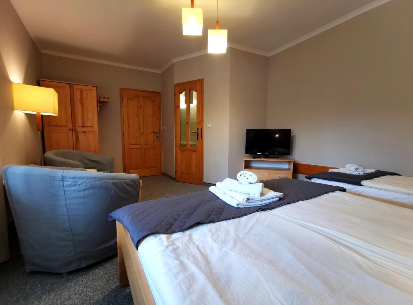 Pokój trzyosobowy. The triple room offers a seating area, a wardrobe, a terrace with garden views as well as a private bathroom featuring a walk-in shower. The unit offers 2 beds. Pokój Trzyosobowy - 3 osobowy. Powierzchnia pokoju ok.: 16 mkw. ;